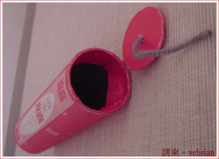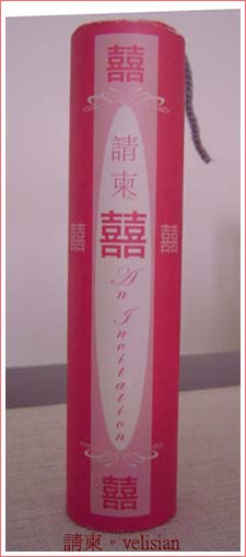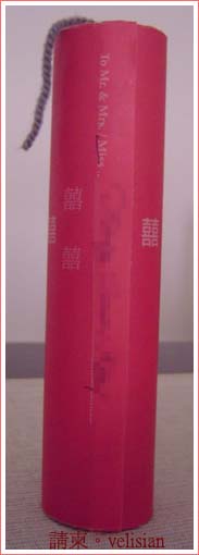 也是全DIY的炸彈請柬﹐很特別﹐那個筒本身是用塑膠水管﹐新娘親手用鋸子把水管給鋸短﹐再用自己設計以及影印好的紅紙包著它們。裡面就裝著請柬的內容﹐很不一樣。