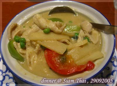 這是Green Curry Chicken 有著很濃很濃的lemon grass味道。我覺得很好吃﹐和在馬來西亞一般泰國餐廳吃到的味道沒有多大分別。但是同事說不好吃﹐說太甜了。