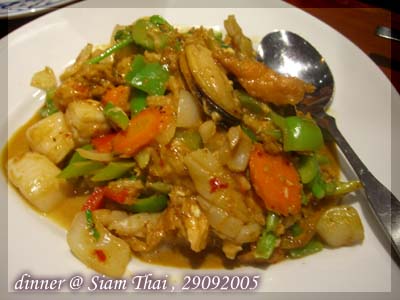 這個我忘了名字的菜﹐是很多很多材料炒在一塊兒的﹐裡面有scalop, oyster,squid,雞肉﹐一些菜。味道甜甜的﹐不過很下飯。我覺得好吃。