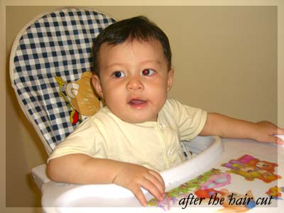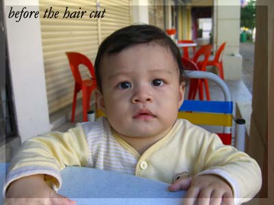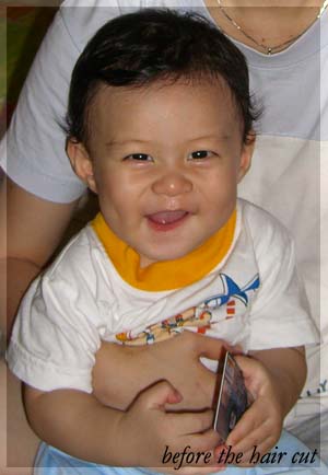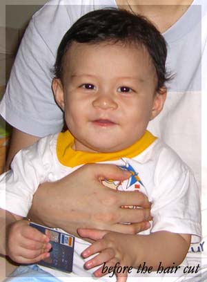 星期二那天﹐二姐親自操刀幫寶貝剪頭髮。這是寶貝出世以來﹐第三次剪頭髮。第一次是滿月時剃光頭。第二次是四個月大時﹐剃得很短很短。這次沒有剪得很短﹐因為寶貝一直動來動去﹐所以只是隨便地把它剪短就算了。