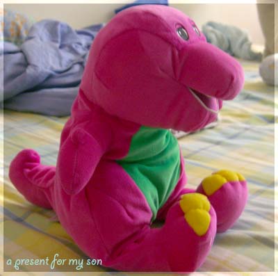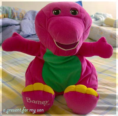 其實我生日那天老公有交待我要什麼禮物自己去買﹐只是我什麼都沒有買給我自己﹐倒是在TOY'S RUS裡頭看到這只特價的Barney公仔﹐而且又是寶貝唯一認識的‘人物’。 高度大小都剛剛好﹐寶貝可以輕鬆的抱著它。當我把Barney給他時﹐他抱著它的樣子實在很可愛﹐又有50%折扣﹐所以我就忍不住就買了下來。至於寶貝抱Barney的可愛模樣﹐就需要給我一些時間去拍下來了。