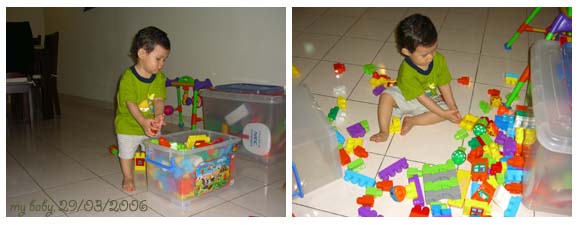 偶爾還是會玩自己的玩具﹐但是玩法已經和以前不一樣了。 把它們倒/搬出來﹐丟到滿屋都是玩具﹐然後讓媽咪去收拾﹐是現在最愛的玩法。