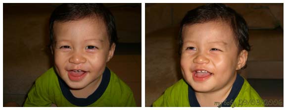 你生氣時﹐他會即刻上前來抱者你﹐或者咯咯咯大聲笑給你聽﹐再送上獨特的親親 - 大口(還不會嘟起嘴巴)+一堆口水的吻猛往你的左右臉攻去﹐把你的整個臉都沾滿口水求饒時﹐保證什麼氣都消了。