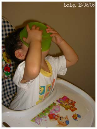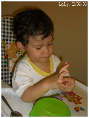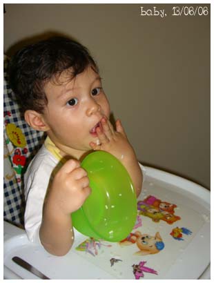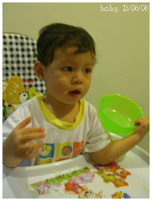 昨晚的晚餐﹐由於沒有準備到寶貝可以吃的食物﹐唯有弄一些白飯加一點菜汁﹐讓他自己吃。