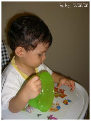 現在他都是自己吃﹐可是平常他都是用叉﹐很少有機會用湯匙。