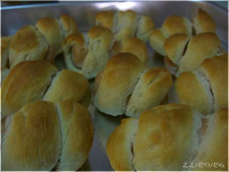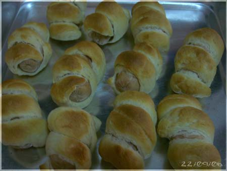 然後她也嘗試做香腸小麵包。 賣相也是好好噢﹐對嗎﹖可是麵包卻好硬噢。趁熱吃還可以﹐冷了後就根本放不進口。![]()