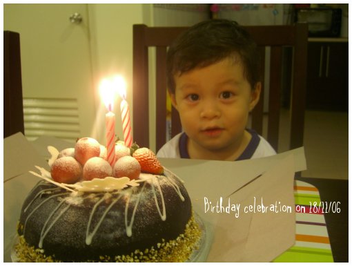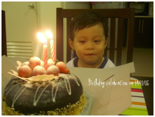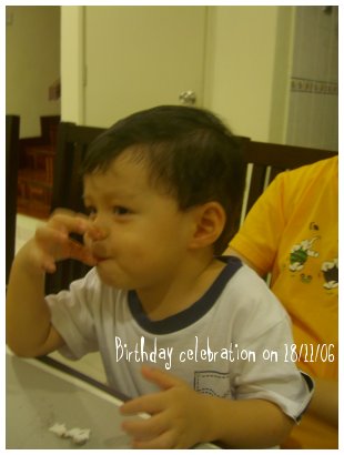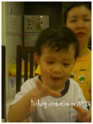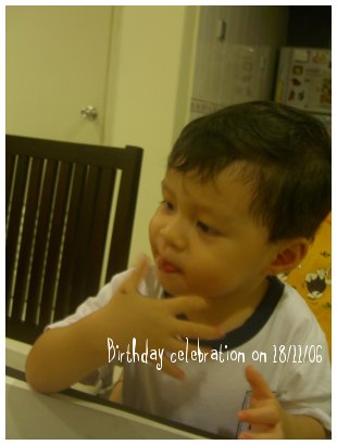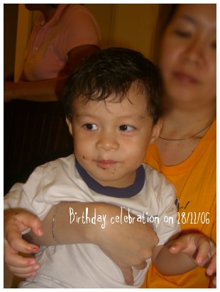 大家在唱生日歌的當兒﹐壽星仔很開心呢﹐不過他開心卻又不敢笑出來﹐一直在在偷偷的笑。