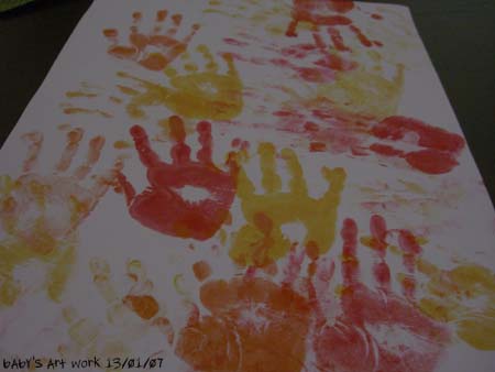 今天下午,和寶貝玩印手掌。妹妹用她的水彩弄了紅,黃兩種顏色。