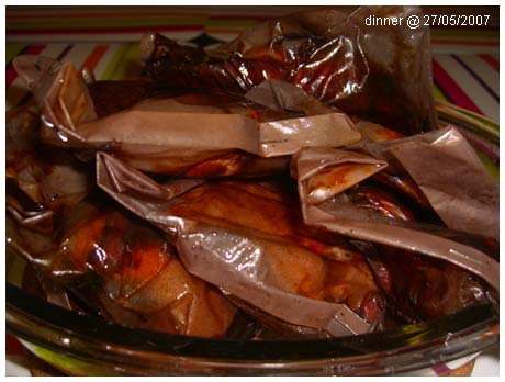 (我都是用中火炸的。 炸的時候紙袋會變焦黑﹐好像裡面的雞肉已經炸焦似的。其實只是紙袋而已﹐裡面的雞肉還是好好。)