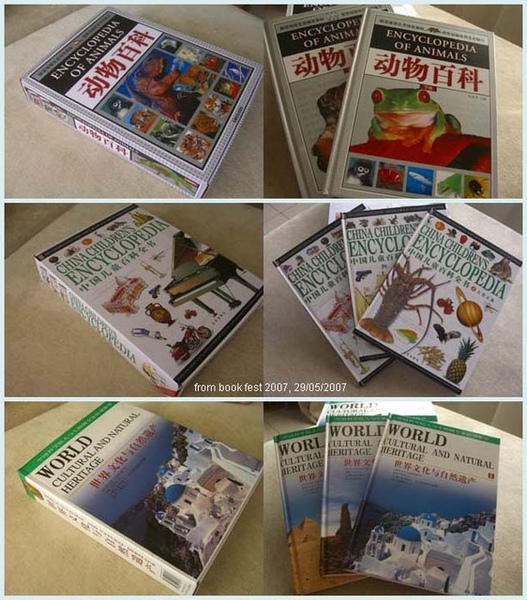 三套百科全書﹐ 最下面那套是買給自己的。原本想要買那個一萬個為什麼的﹐卻賣完了。