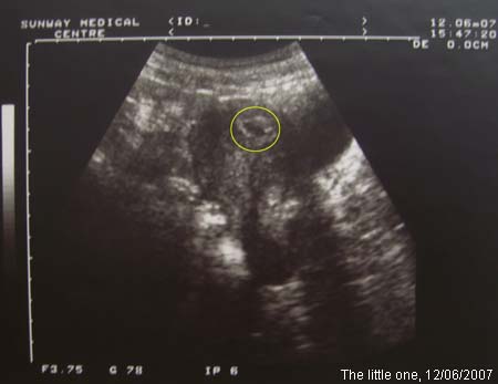這是上兩個星期去看醫生時拍的。 圓圈中黑色的是裝胎兒的袋子,胎兒還沒有看到。