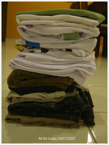 這一堆﹐全都是寶貝的衣服 。。。5件褲子﹐3套睡衣和5件上衣
