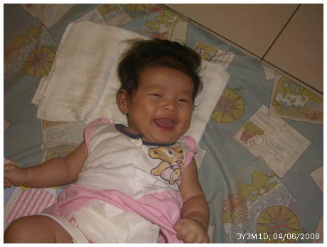 這是哥哥在一旁說 "Please 睡覺" 時﹐她就笑得喀喀喀聲。