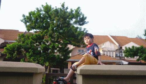這孩子突然間跟我說他要坐在籬笆上的柱子,